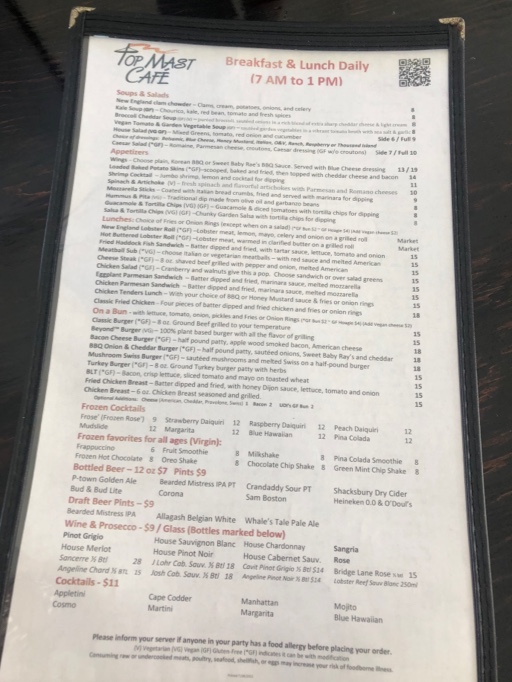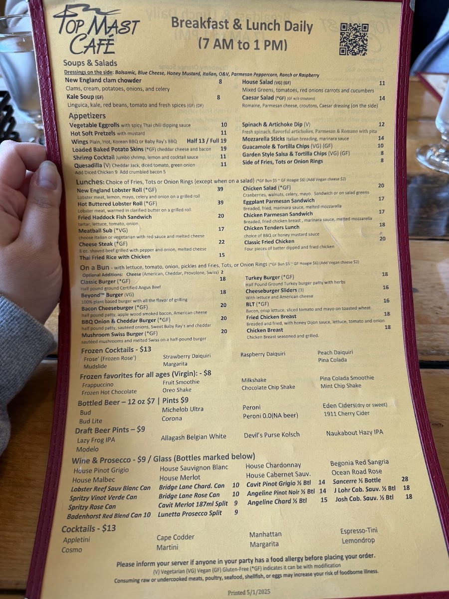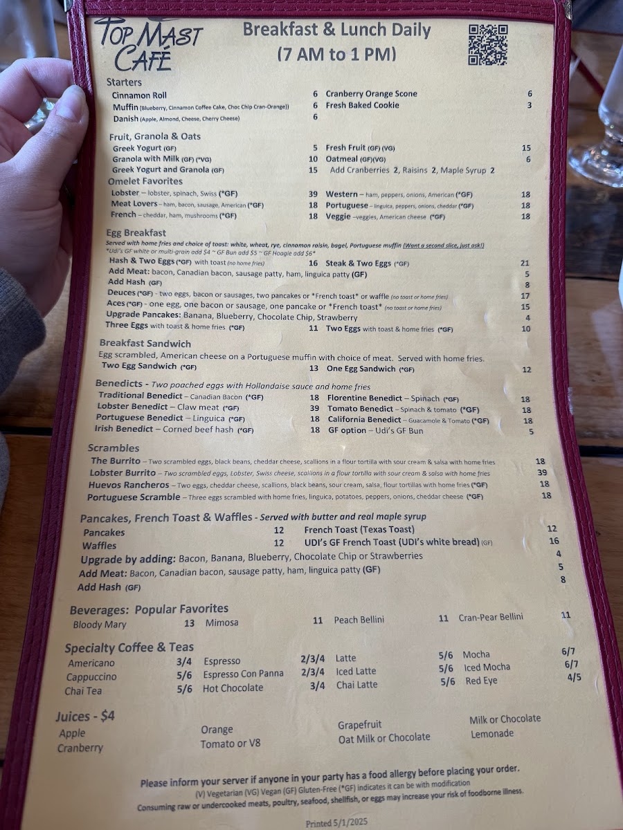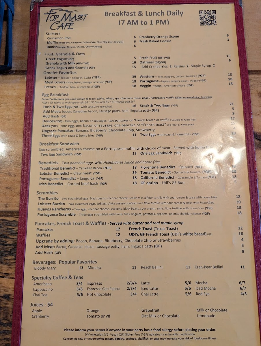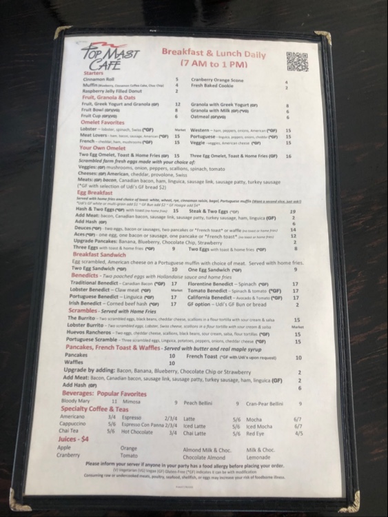Menu at Top Mast Cafe strikes a smart balance between classic comfort and Cape Cod flair, with breakfast doing most of the heavy lifting. If you want something hearty and built-to-order, the Omelette lineup delivers that reliable, diner-style satisfaction, while lighter starts like Perfect and Granola make it easy to keep things simple without feeling like you’re “settling.” The standout indulgences are the benedicts-Lobster Benedict feels like the signature splurge, and Irish Eggs Benedict adds a richer, more savory twist for anyone craving extra depth. For a Southern-leaning plate that still fits the coastal vibe, Shrimp & Grits brings a bold, comforting contrast to the usual breakfast rotation. Pancake fans get plenty of fun options, from Upgrade Pancakes to kid-friendly Mickey Pancakes, and sweeter cravings are covered with the Chocolate Pancakes or French Toast Platter. If you’re aiming for a straightforward, filling plate, the Breakfast Sandwich with Home Fries is the dependable choice, while Scrambled Eggs with Hash and Rye Toast keeps things classic and satisfying. On the beverage side, the Dirty Chai with Oat Milk is the kind of upgraded pick that feels modern without being fussy. For something portable and packed, The Burrito rounds out the menu with an all-in-one option, and if you’re shifting away from breakfast, Soup & Salad offers a clean, lighter reset that still feels like a complete meal.